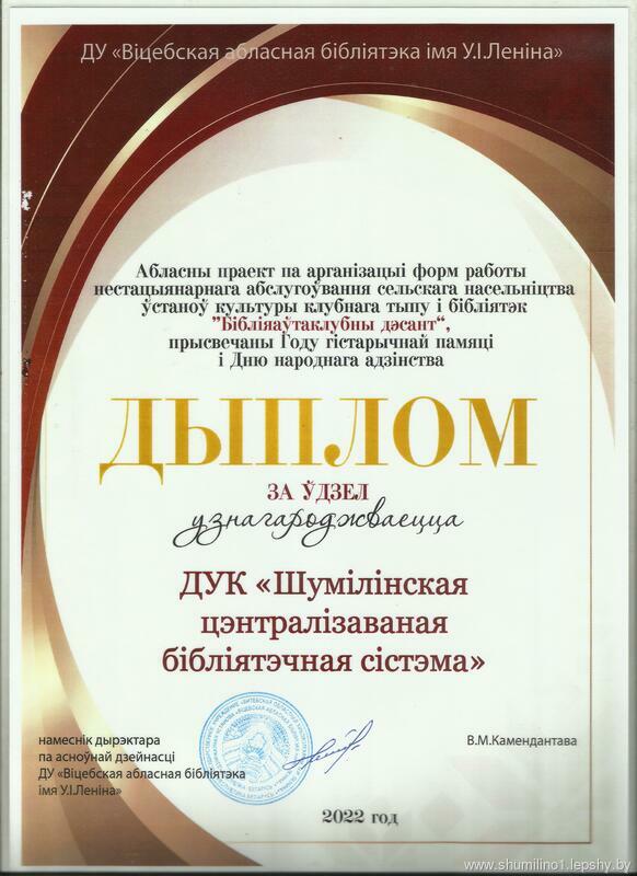 21 сентября работники Библиобуса Центральной районной библиотеки и филиала "Автоклуб" Шумилинского РЦК приняли участие в областном проекте по организации форм работы нестационарного обслуживания сельского населения учреждений культуры клубного типа и библиотек "Библиоавтоклубный десант", посвящённом Году исторической памяти и Дню народного единства на базе учреждения культуры Бешенковичского района.